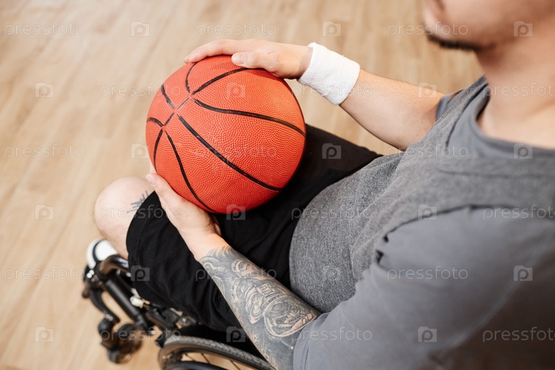 Top View Спортсмен с помощью инвалидной коляски играет в баскетбол