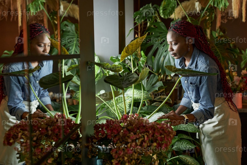 Девушка, заботящаяся о растениях в цветочном магазине