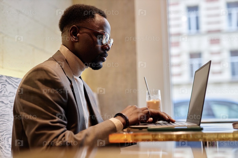 Работающий афроамериканец в офисной обстановке выглядит сосредоточенным
