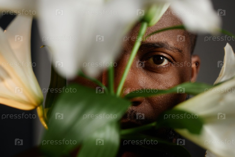 Чернокожий мужчина, снятый через цветы и смотрящий на камеру со скорбным взглядом в студии