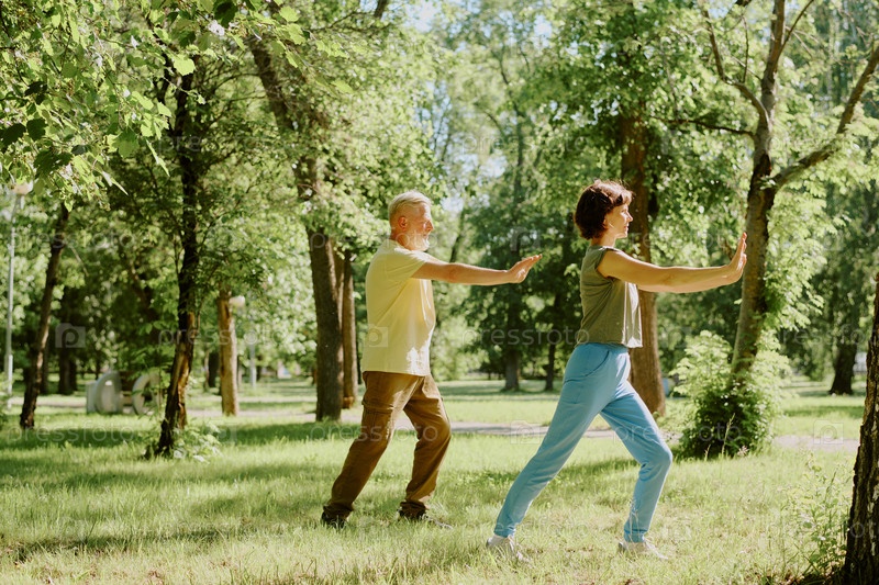 Старшая пара, занимающаяся тренировками на открытом воздухе