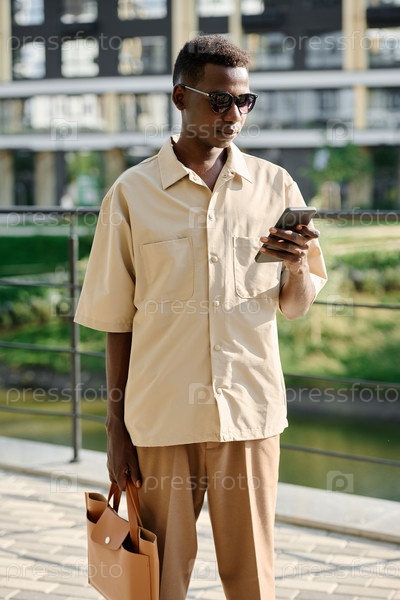 Молодой чернокожий офисный работник смотрит на экран смартфона
