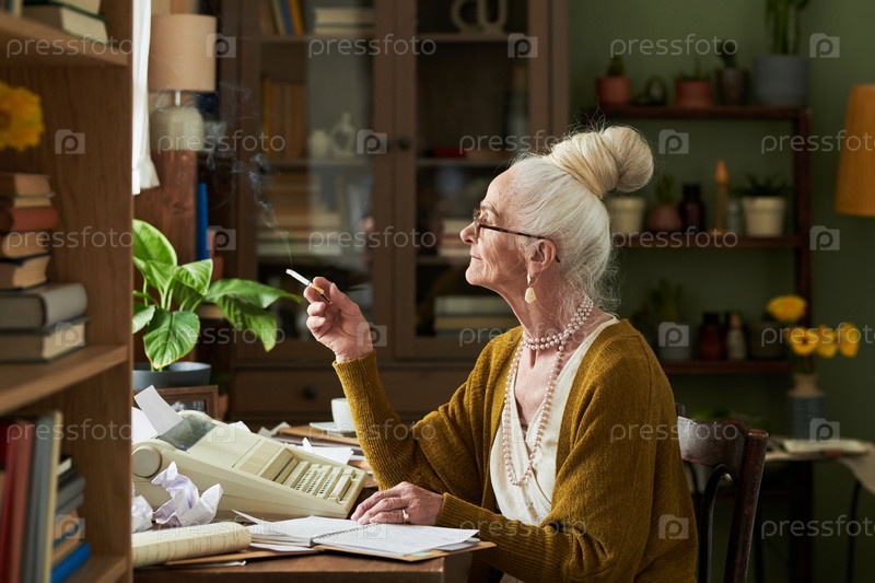 Пожилая женщина курит сигареты, работая за столом