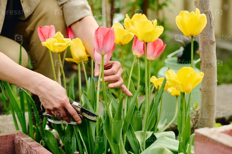 Садовник режет тюльпаны с помощью обрезателя