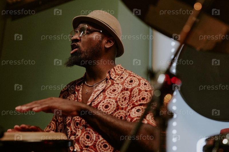 Бородатый мужчина поет, играя в конгу