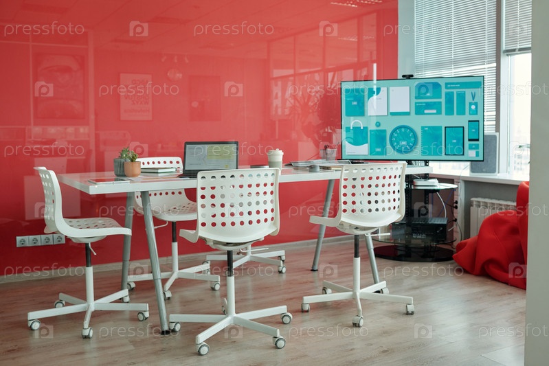 Зал совещаний с красной стеной и большим экраном