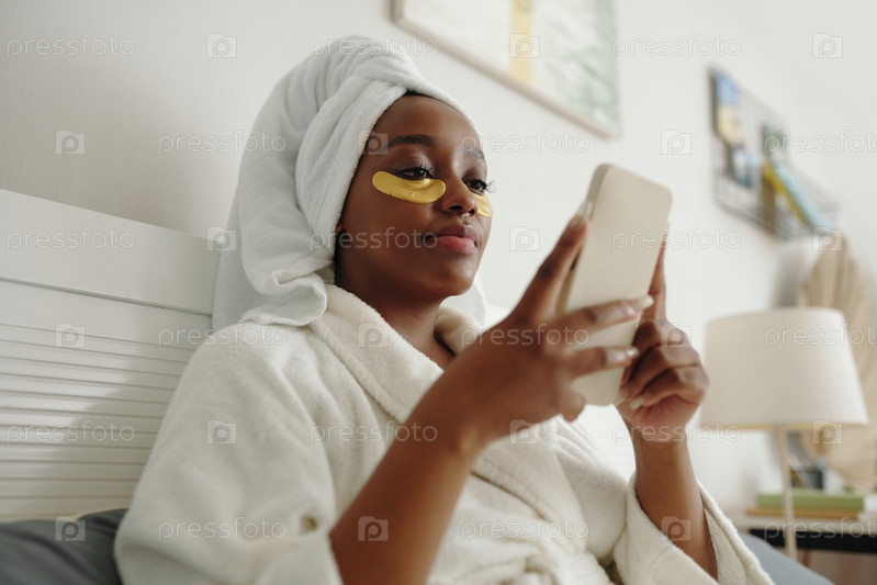 Женщина, носящая золотую маску для глаз и использующая смартфон расслабляется