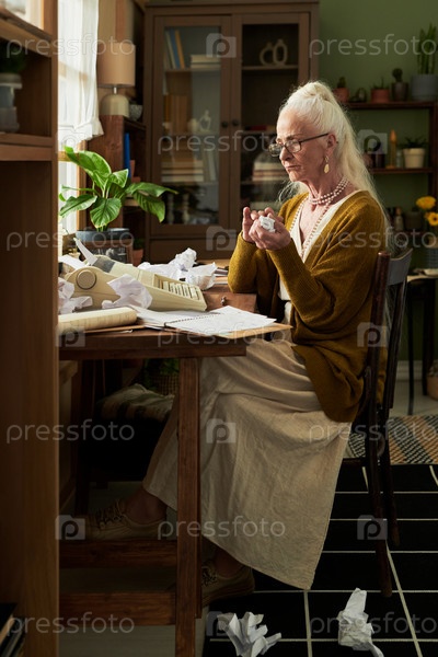Концентрирующаяся старшая женщина работает в уютном домашнем офисе