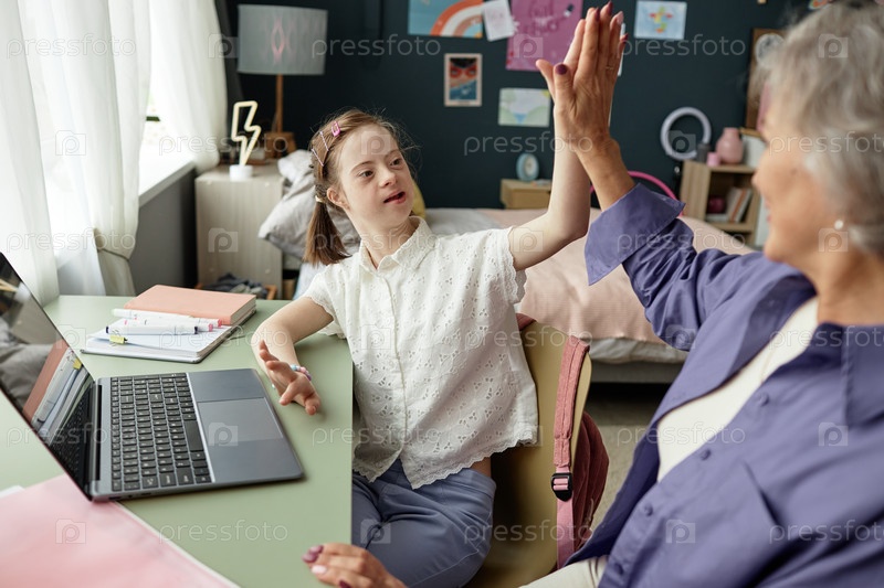Празднование достижений с высокой пятеркой в учебной комнате