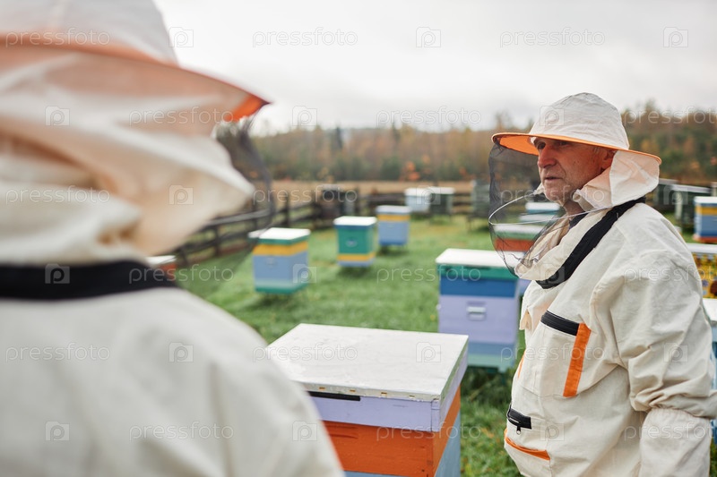 Пчеловод в костюме с коллегой на Апиарной ферме