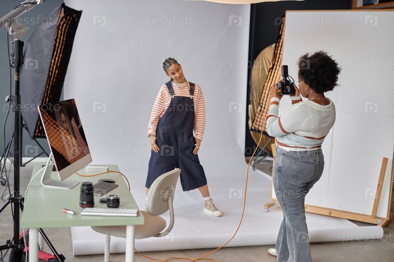 Фотограф фотографирует молодую девушку поколения Z в студии