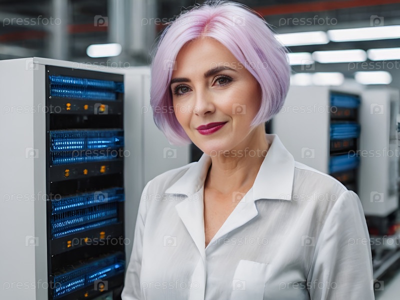 Портрет улыбающейся женщины в обстановке серверной комнаты