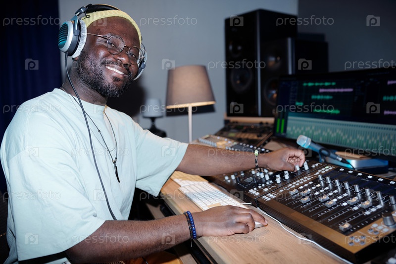 Улыбающийся мужчина управляет оборудованием для смешивания звука в студии