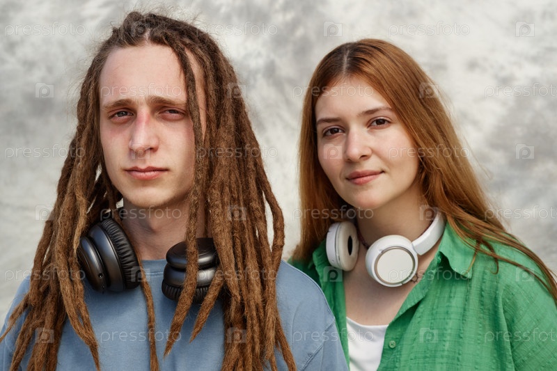 Портрет молодых людей, носящих наушники и улыбающихся вместе