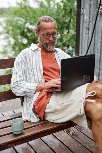 Человек с помощью компьютера отдыхает на скамейке в природе