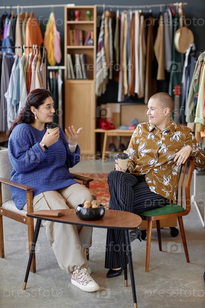 Женщины Z-генерации беседуют, сидя на стульях в магазине Thrift Store
