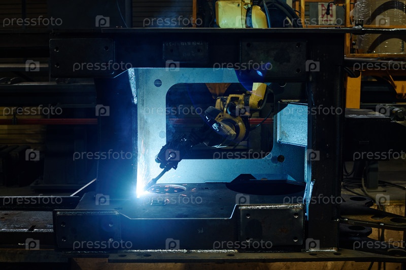 Роботизированная рука сварки металлического каркаса в промышленной обстановке