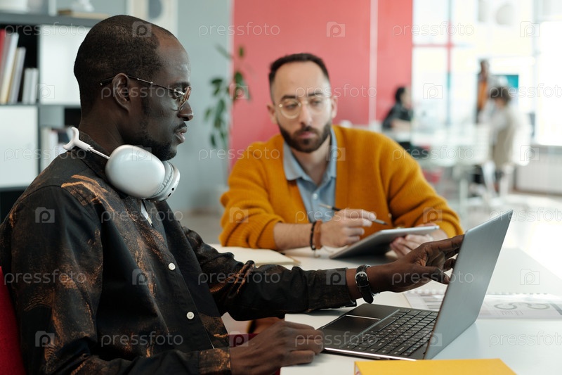 Коллеги, работающие вместе на ноутбуке в современном офисе