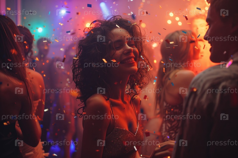 Улыбающаяся женщина танцует на праздничной вечеринке с конфетами