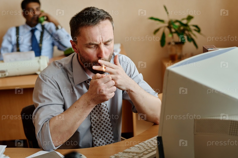 Бизнесмен курит в офисе возле компьютера