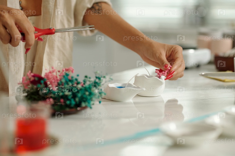 Женщина, использующая сушеный цветок для изготовления свечей