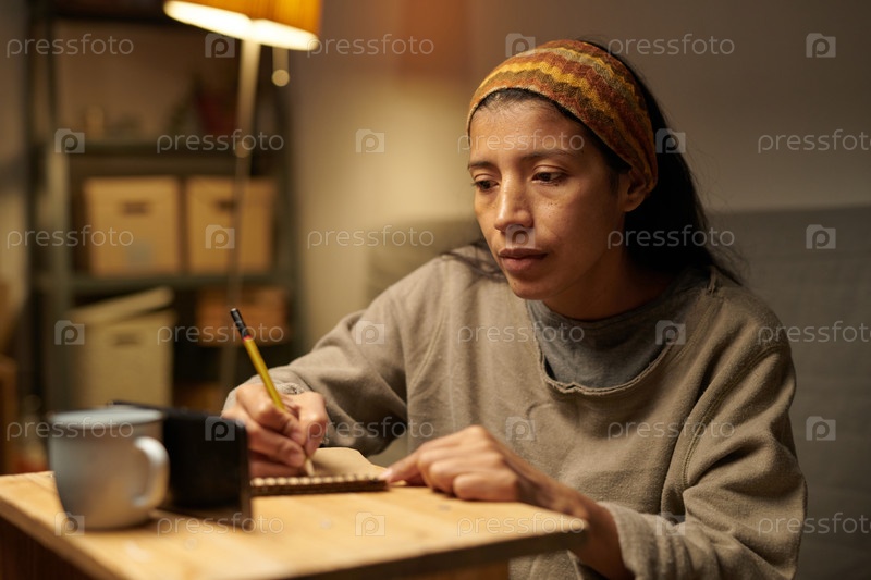 Созерцание женщины, пишущей заметки в уютной гостиной