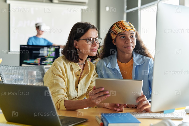 Учительница использует планшет, работая со студентом