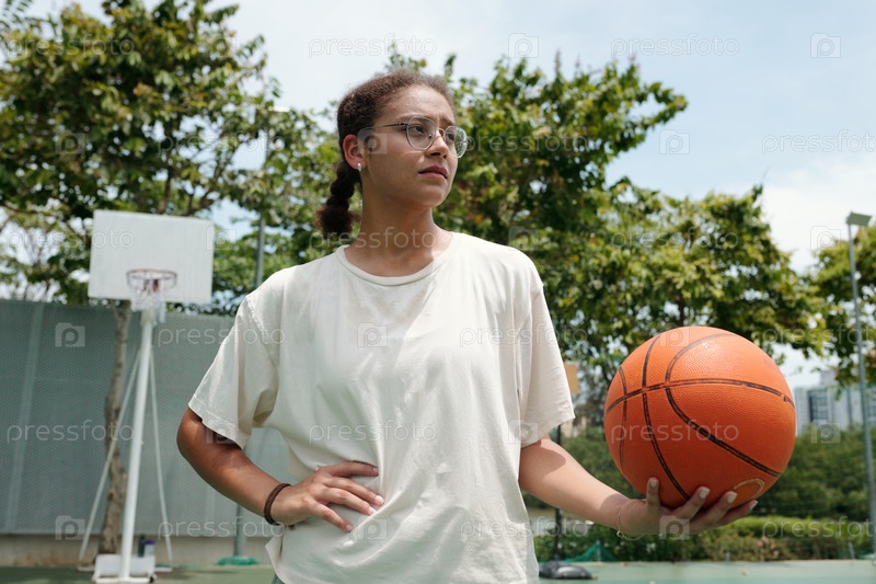 Женщина держит баскетбол на открытом поле
