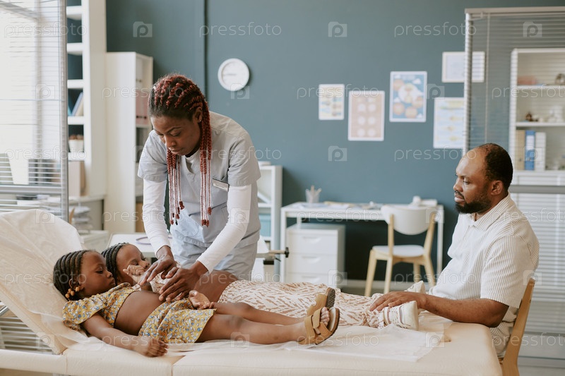 Тщательная медсестра осматривает ребенка в комнате детской клиники