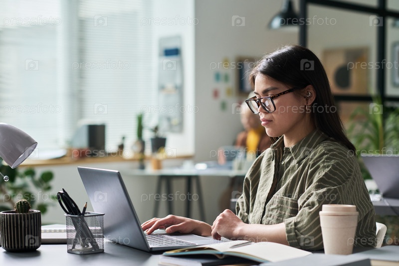 Концентрируясь на работе в современном офисном рабочем пространстве