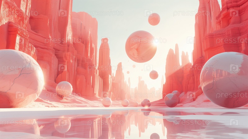 Плавучие сферы в абстрактном розовом пейзаже пустыни
