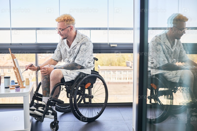 Энтузиаст по живописи сидит в инвалидном кресле, проверяет полотно