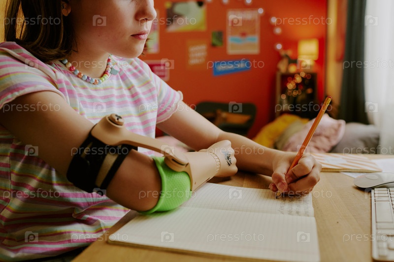 Девушка с протезом, выполняющая домашнее задание
