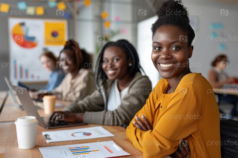Улыбающаяся деловая женщина участвует в встрече команды