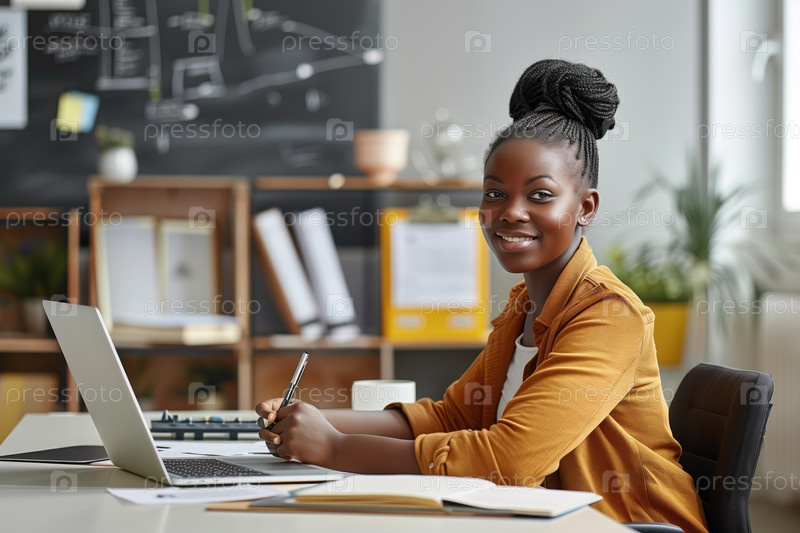 Улыбающийся сотрудник держит ручку за столом в современном офисе