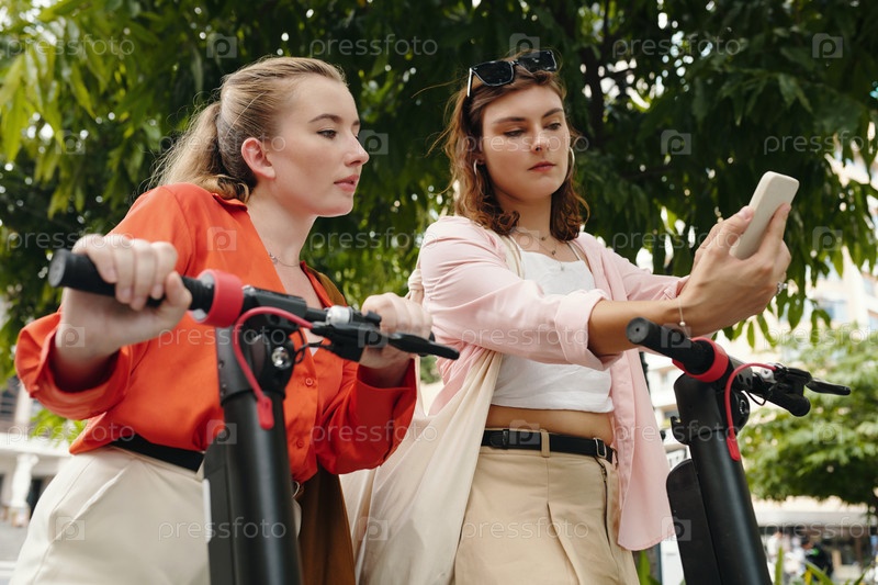 Две женщины едут на электрических скутерах, проверяя смартфоны