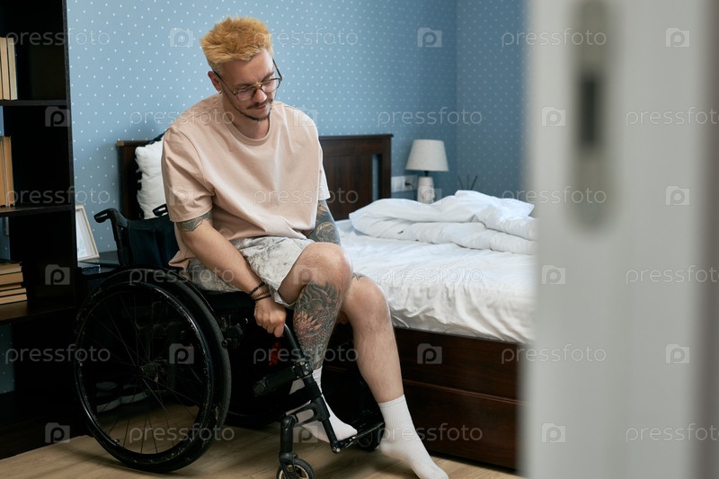 Посещение молодого человека в инвалидной коляске в спальне