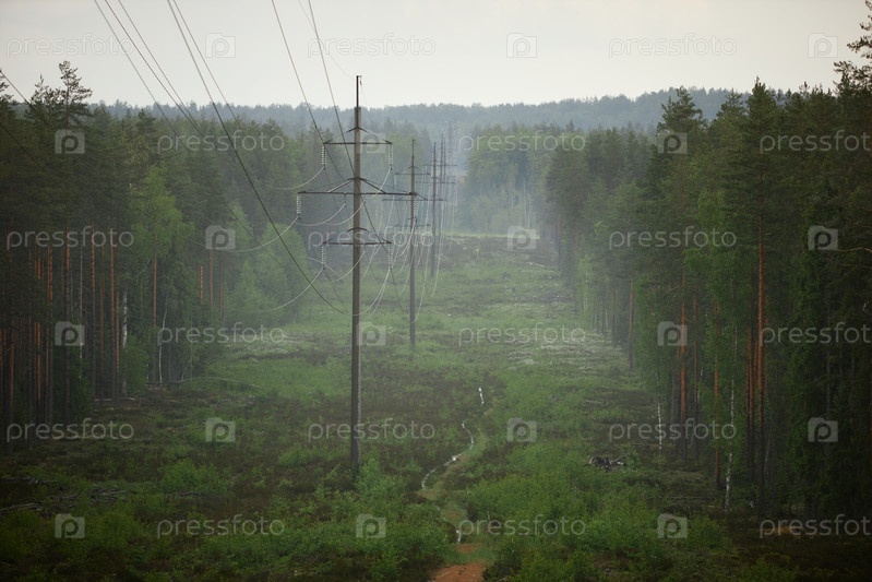Линии электропередач прорезают лес на туманном фоне