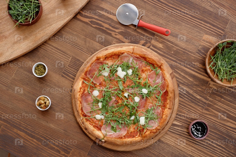 Вид на пиццу на деревянном столе
