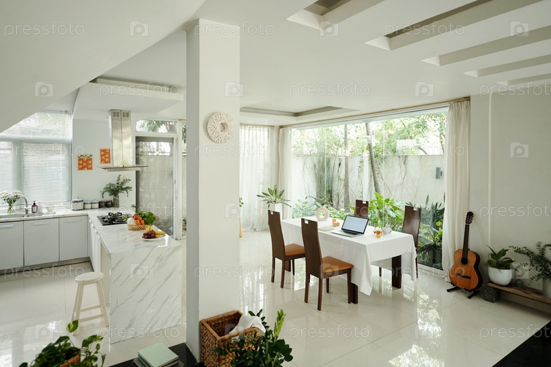 Обеденный стол в кухне белого дизайна
