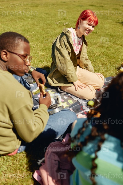 Улыбающаяся девочка-подросток на зеленой лужайке наслаждается пикником с друзьями в солнечный день