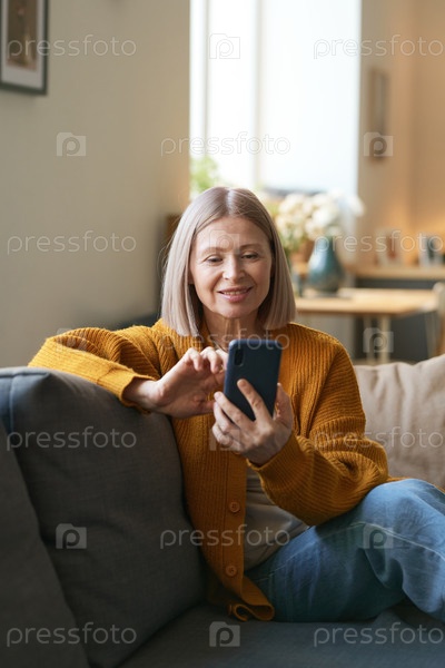 Зрелая женщина, держащая смартфон, сидит на диване