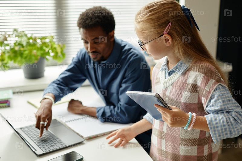 Ученица слушает учителя, указывающего на клавиатуру ноутбука в классе