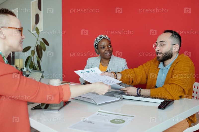 Коллеги делятся документами во время офисной дискуссии