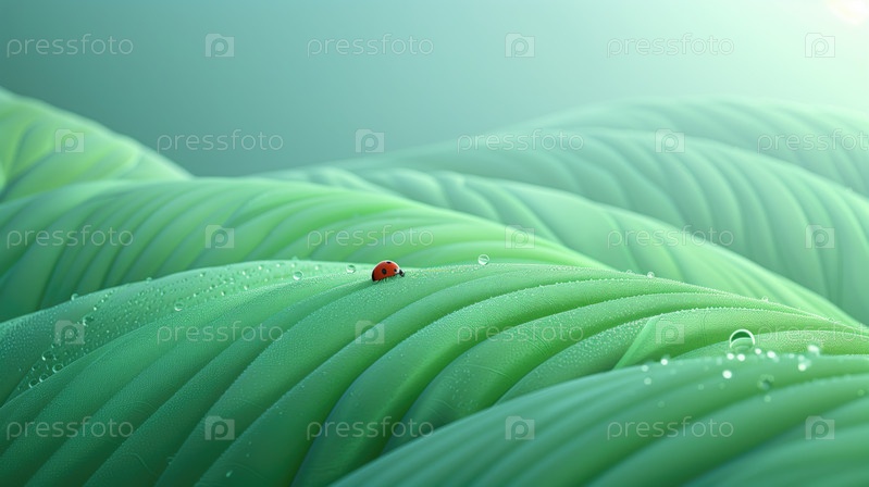 Ледибэг отдыхает на зеленых листьях, покрытых росой