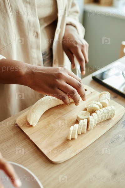 Руки чернокожей женщины, режущей бананы на бежевом кухонном столе