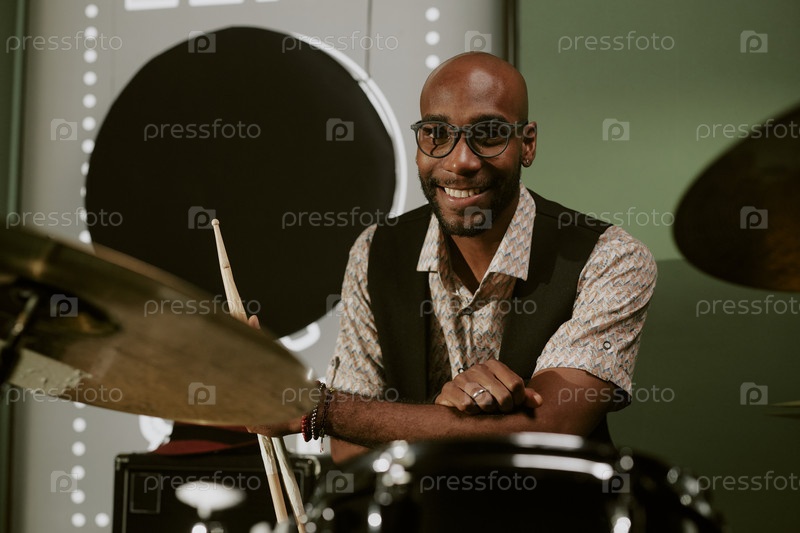 Молодой черный барабанщик улыбается перед камерой
