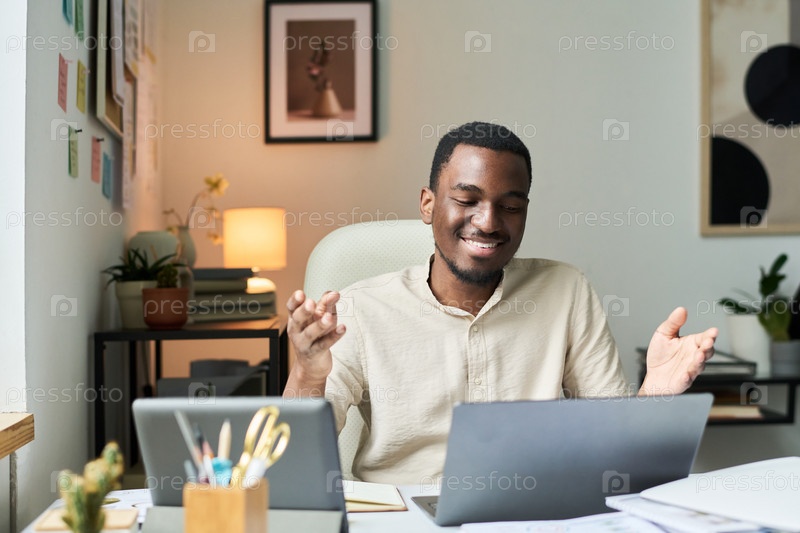 Улыбающийся мужчина работает за столом в домашней офисной обстановке