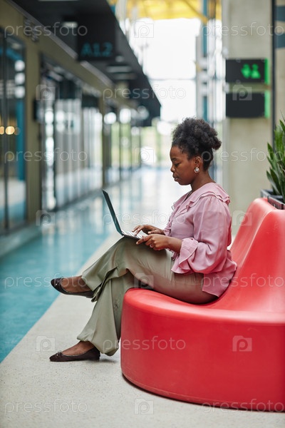 Черная женщина сидит на диване в гостиной, используя ноутбук во время работы в офисном центре