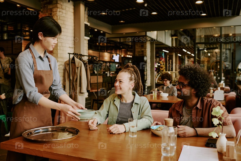 Дружелюбный сервер приносит блюда в уютном ресторане
